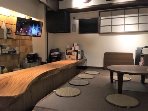 中も落ち着いた雰囲気で、入口から入って階段を数段上がると、小上がり席にちゃぶ台まであるという、超個性的な造りです。ちなみにカウンター席は、足を入れて腰掛けることができます。オーナーは建築のお仕事をされているので、お店の意匠はとても洗練されていて、カジュアルにくつろげる空間となっています。開店から1年足らずですが、ここからカップルが生まれたり、仕事のつながりが生まれたりもあったそうです。