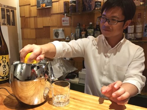 こちらがオーナーの有江さん。柑橘類の果汁を余すところなく搾り取れるマシーンを使って生搾り。