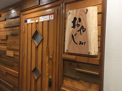 「おやじbar」という名前から、中年のおじさんが、野球中継を見ながら焼酎とするめを出しているような、ちょっと古めのバーを想像していましたが、いやはやこれは、風格ある看板とドア!