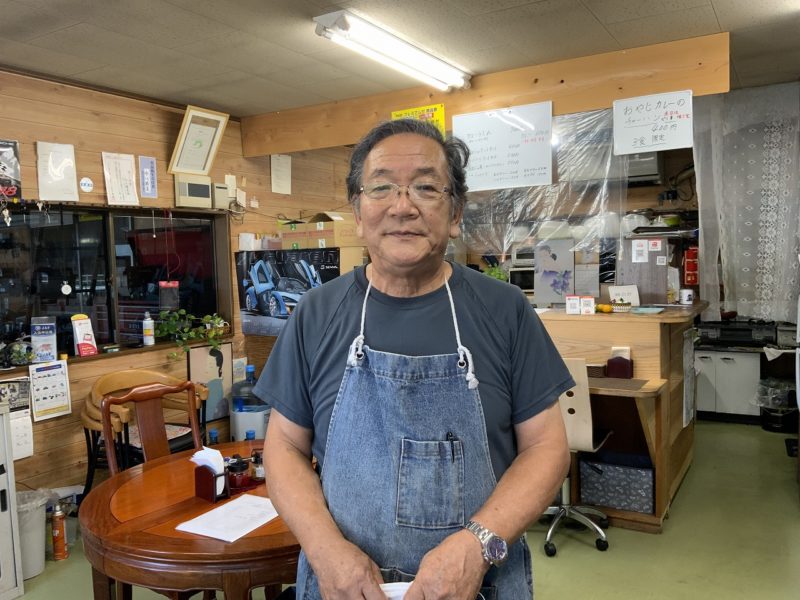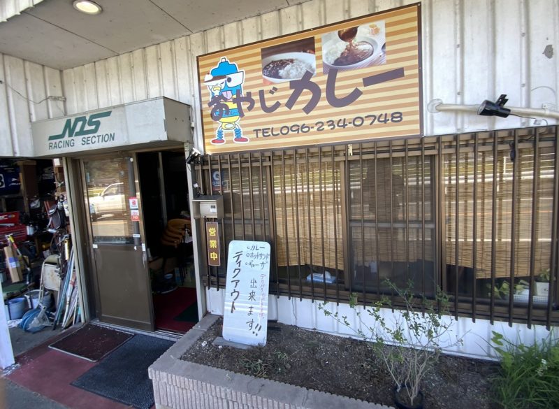 甲佐町にある自動車整備店「中川モータース」。車を整備しているお隣に「おやじカレー」の看板が出ています。
