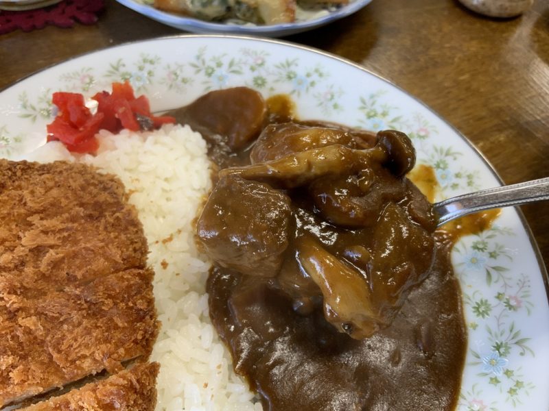 そもそもカレーにサイコロステーキとか贅沢すぎですが、これもホロホロになるまで煮込んであるので、口に入れると一瞬で消えます。