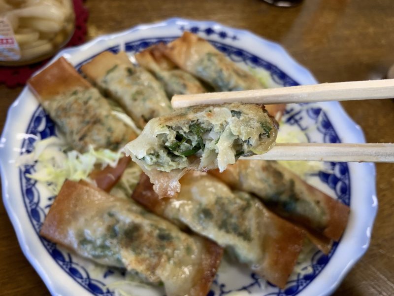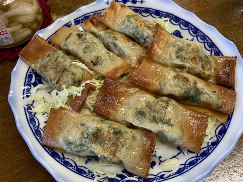 実はこれ、餃子の皮ではなくて春巻きの皮。たっぷりの甲佐町産のニラを豚ひき肉、にんにく、大葉などを包んで焼いています。