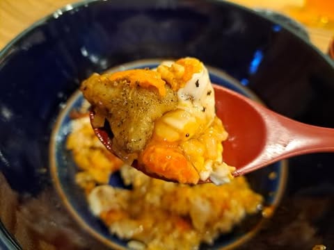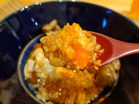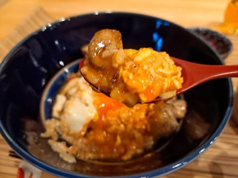 スプーンの中に焼き目の入った鶏と溶き卵、黄身がたっぷりついたタレ付き御飯。