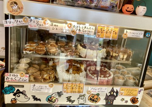 ケーキのラインナップはこちら。週替わり・イベントによって変わるそう。ハロウィンが近いということで、ケーキもハロウィン仕様になっています。どれも可愛らしいケーキばかり。よく見ると、プリンやタルトなどは250円~あります。手軽におやつを食べたい時にいいですね。