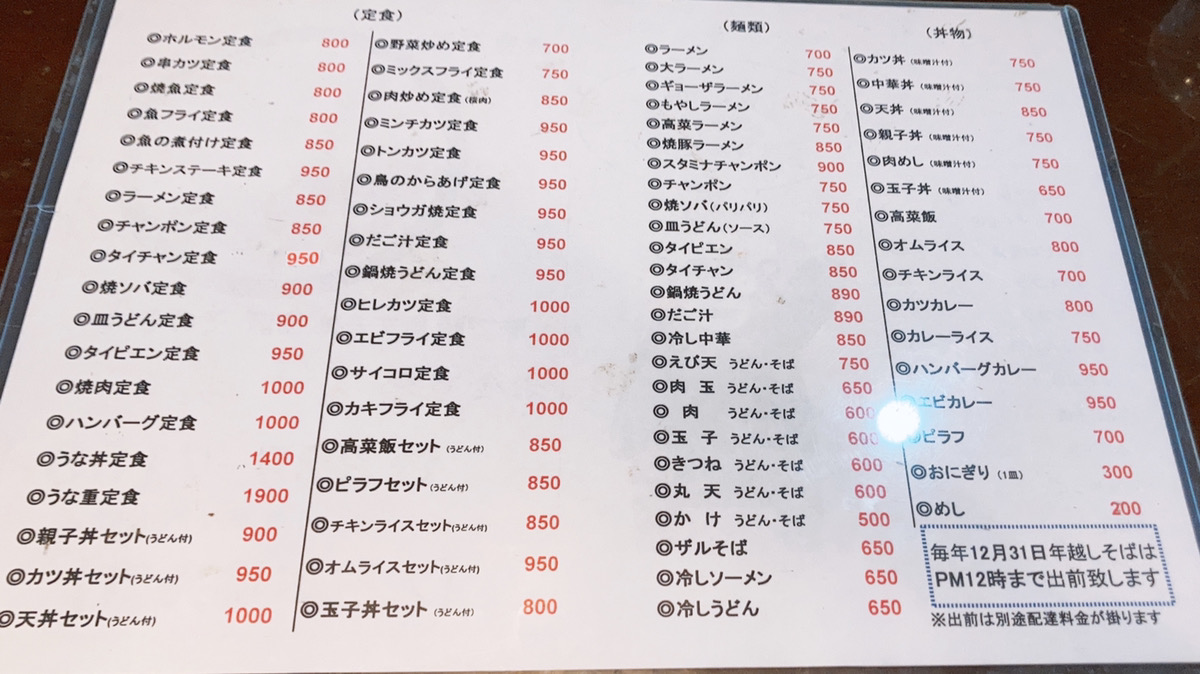 こちらがお食事メニュー。ずらーっと並んだ料理は定食から麺、丼ものまで豊富。麺なんて、ラーメンにチャンポンにうどんにそばに…太平燕もあります。なんでも出てくる!