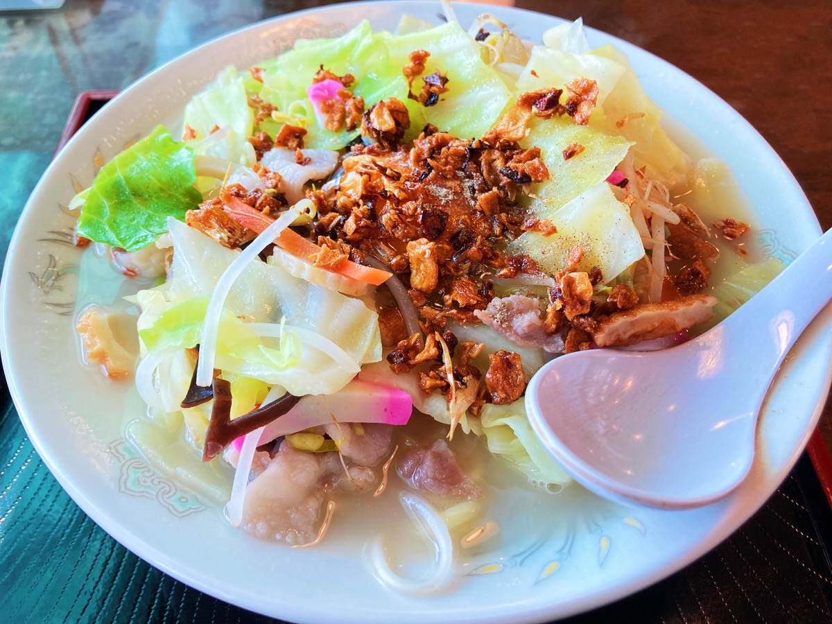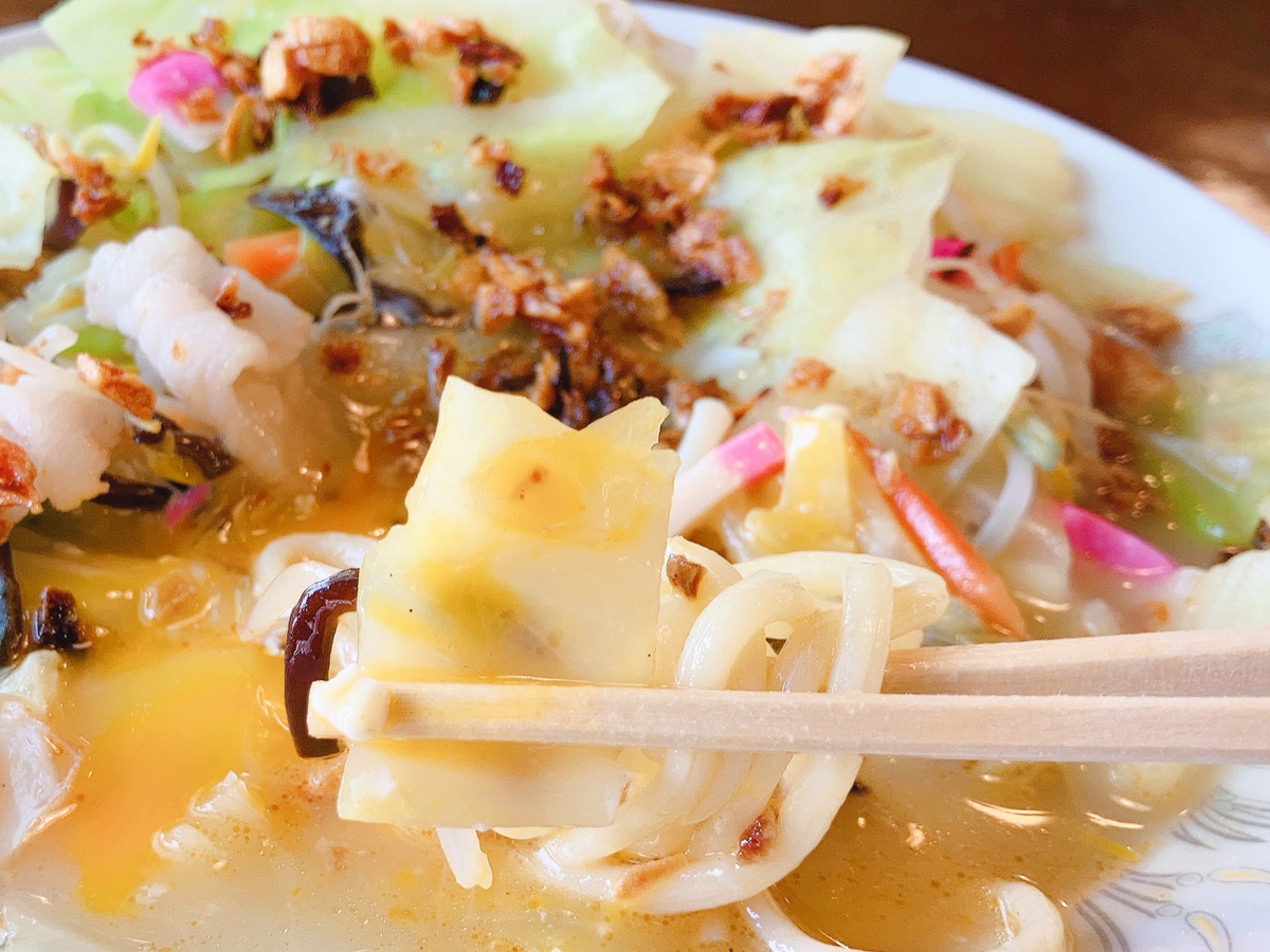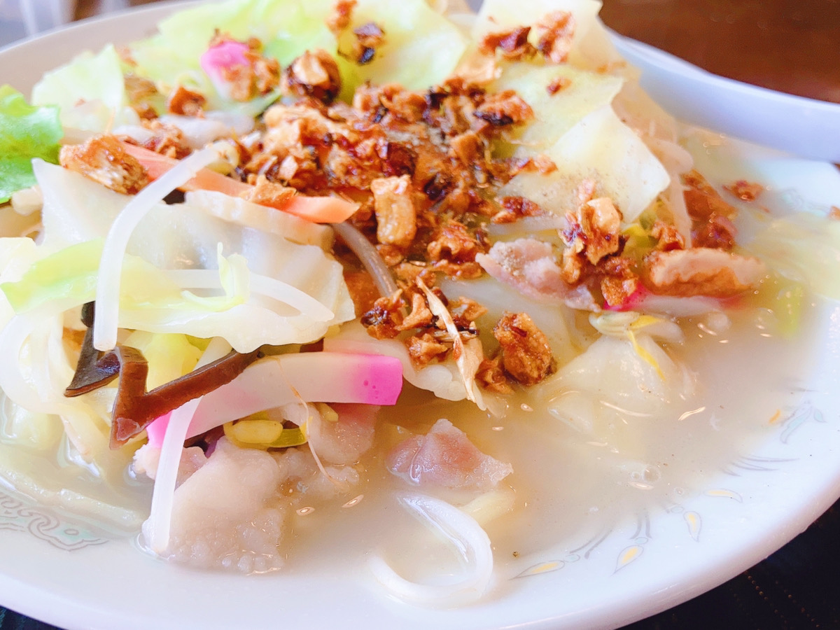 スタミナチャンポンには特別なトッピングが。熊本ラーメンでおなじみ揚げニンニク。
