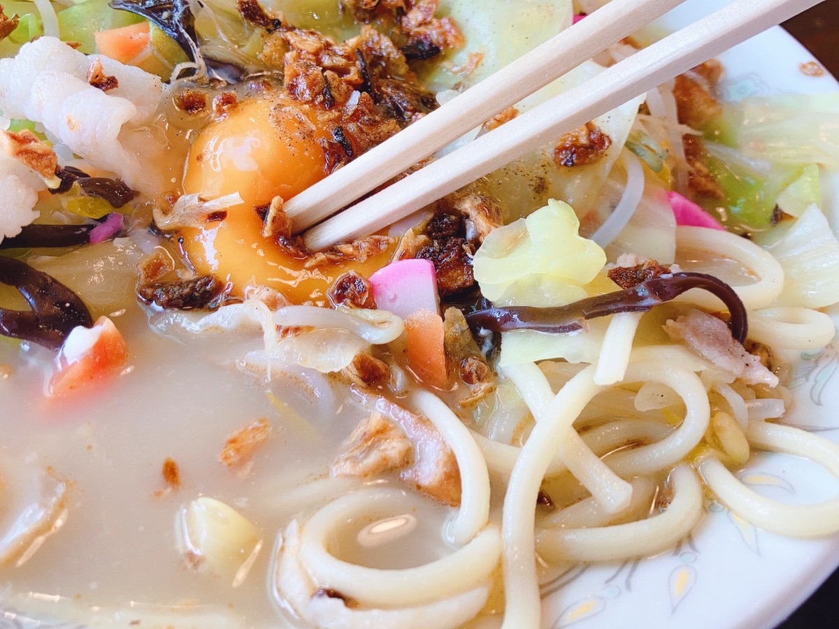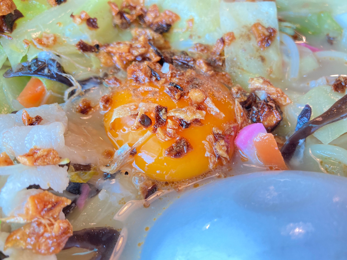絡めて食べると…最高に合うっ。コクのあるスープに卵が加わることで、口当たりがマイルドに。卵のおかげでどっかりせず美味しく食べ進めることが出来ます。
