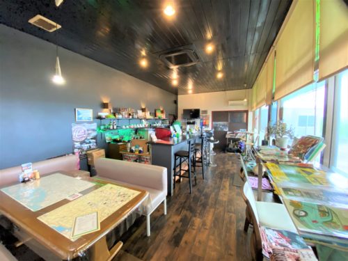 店内はカウンター席やテーブル席が並んでいます。やっぱり「バイク屋さん」ではなく「カフェ」でした。