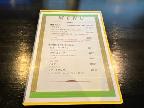 メニューを見るとコーヒーだけでも【サイフォン】【ペーパードリップ】【マッハ】の3種類のほか、アイスの乗った【コーヒーフロート】や、炭酸入りコーヒーの【スパークリングコーヒー】もあるとのこと。