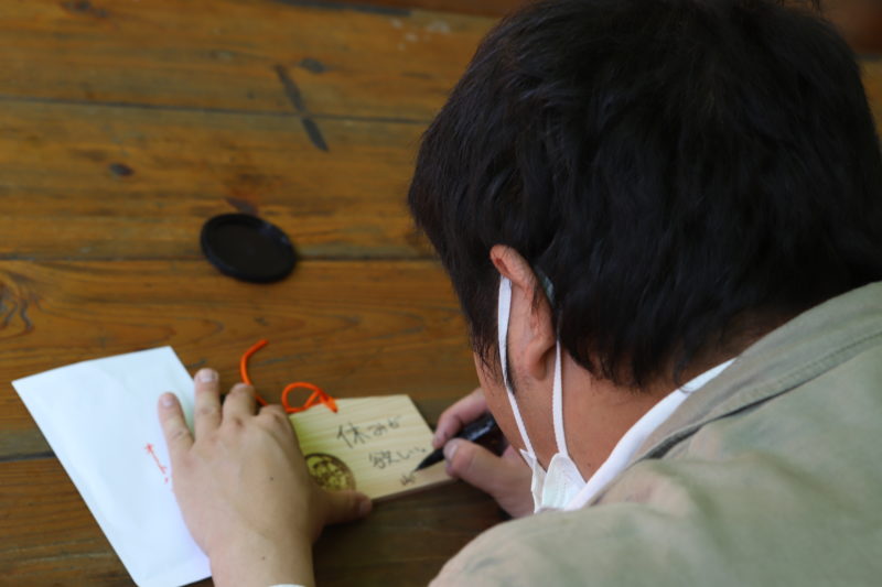 裏にはかわいい焼き印が。さてさて、本当は原付取材の環境改善に来たのですが、欲にまみれる私、何を祈願しようか悩みますね。