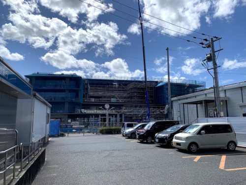 2016年4月の熊本地震の後、長らく仮庁舎で業務を行なっていた大津町役場。(写真は2021年3月の建設現場です)