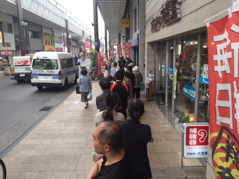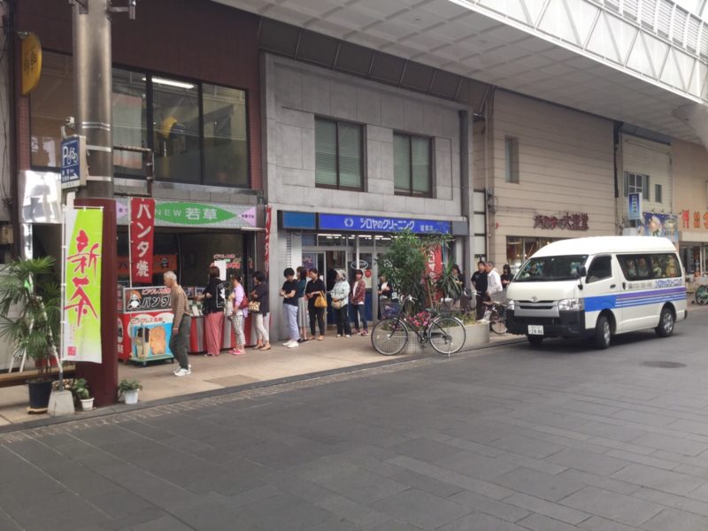 朝から健軍商店街に訪れると、「ニュー若草」の前には長蛇の列!車で見えませんが、もっと後ろまでずらーと並んでいます。写真を撮っている間にも、次々と人が並んでいました。