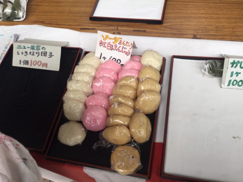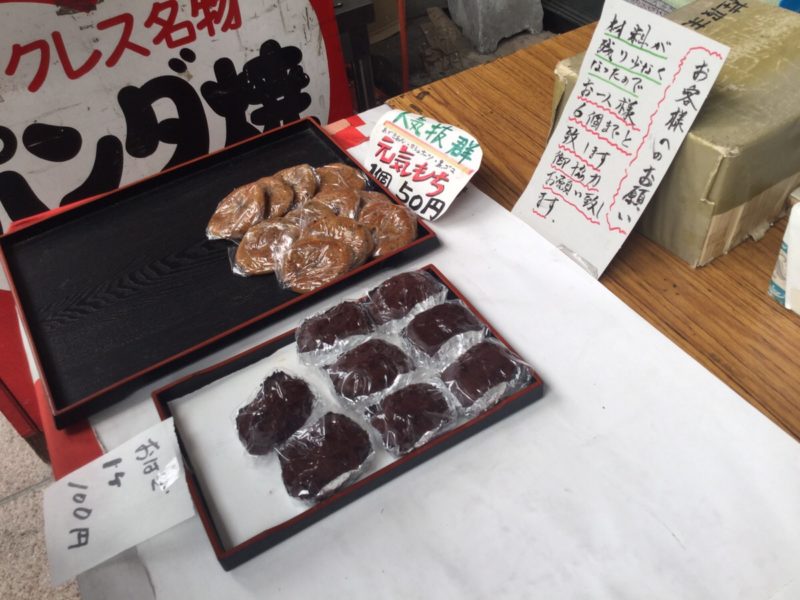 また「ニュー若草」は和菓子屋なので、「パンダ焼き」以外のお菓子も並んでいます。昔ながらの紅白まんじゅうや、ソーダまんじゅう。柏もちに、いきなり団子も。