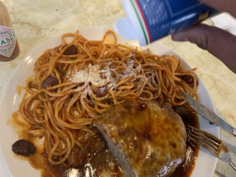 ということで、長洲町の老舗喫茶レストラン「パントマイム」で大盛りナポリタンとジャンボサイズのチーズバーグが一緒になった「ジャンボスペシャル」をいただいてきました!