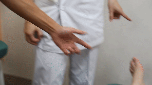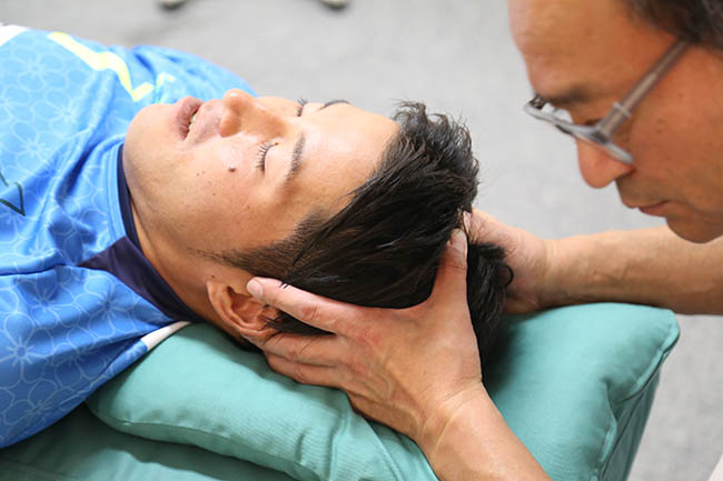 頭もゆっくりと圧を賭けるように押し込み、首の関節を締めている様子。岩崎さん曰く「今までに受けたことのない感覚の施術でした」とのこと。
