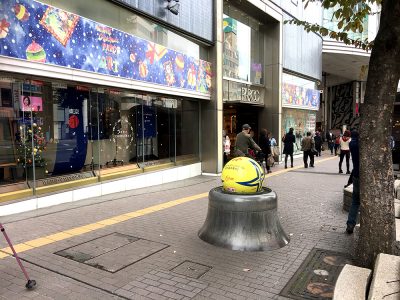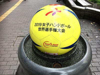 通町筋の熊本パルコ前にある通称”パル玉”。一般的にはグラニットボールと呼ばれるもので、丸い玉が水に押し上げられてくるくる回っている、知名度抜群で待ち合わせ場所にも使われているモニュメント。11月25日からこの”パル玉”が2019年女子ハンドボール世界選手権大会仕様になっています!!
