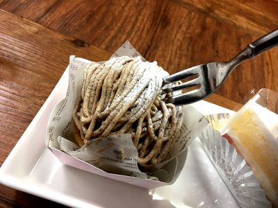 このモンブランはなかなかのサイズの大きさ!それもそのはず、実はこのケーキの中に大きめの栗が一個丸ごと入っており、それをすっぽりと覆ってしまっているユニークさ!