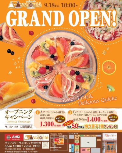 合志市のアンビー内に、タルトとキッシュこの2種類のみを販売するケーキ屋さん「パティスリーヴォロンテ」がオープンするとの情報を入手。