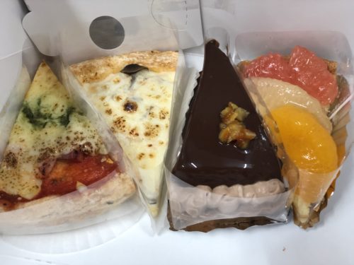 急いで作っていただいたのがキッシュ2個(トマト、ツナきのこ)とタルト2個(フルーツタルト、チョコタルト)のBセット。タルトは下にムースやスポンジが入ったミルフィーユ状になっているので、豊かな風味を味わえますよ。