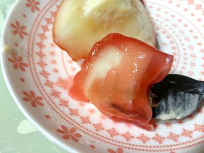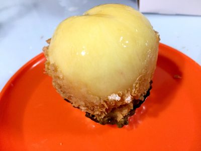 口の中に入れた瞬間、桃の糖蜜が含まれた水分がじゅわっと口の中に広がります。
