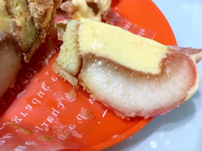 オ・ボン・マルシェさんは新屋敷にあるタルトで有名なケーキ屋さん。「ここのタルトが一番好き」という声も私の周りでは多いです。こちらの「桃まるごとケーキ」は「桃のパイ」です。