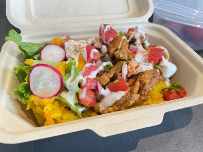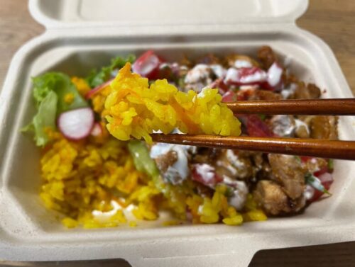 黄色いターメリックライスの上に、野菜とお肉がたっぷりとのっています。