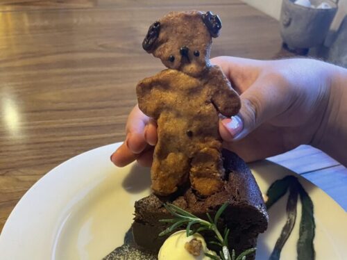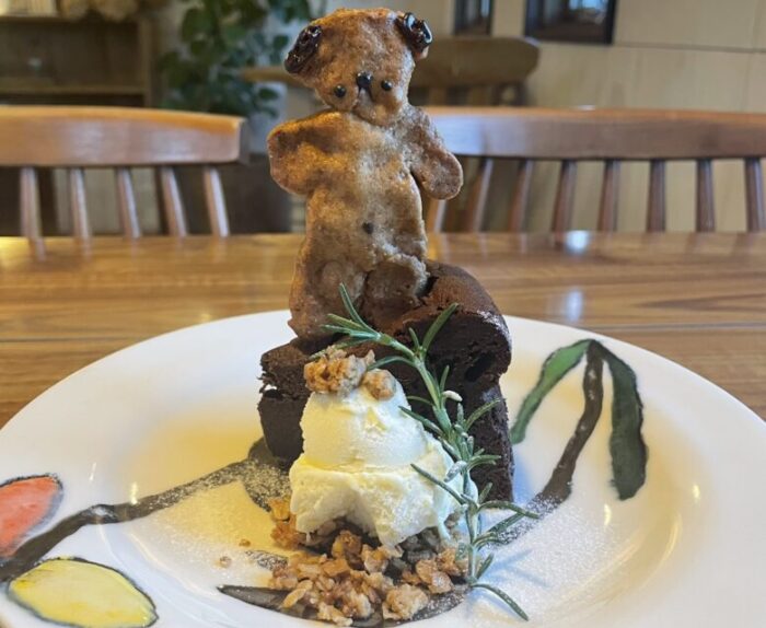 ガトーショコラの上にはくまちゃんクッキーが乗っています。ガトーショコラは外側はふわふわ、中がしっとり濃厚で美味しいです。トッピングのアイスクリームと相性抜群!てっぺんに乗ってるかわいいくまちゃん食べるのがもったいないほどかわいいですが