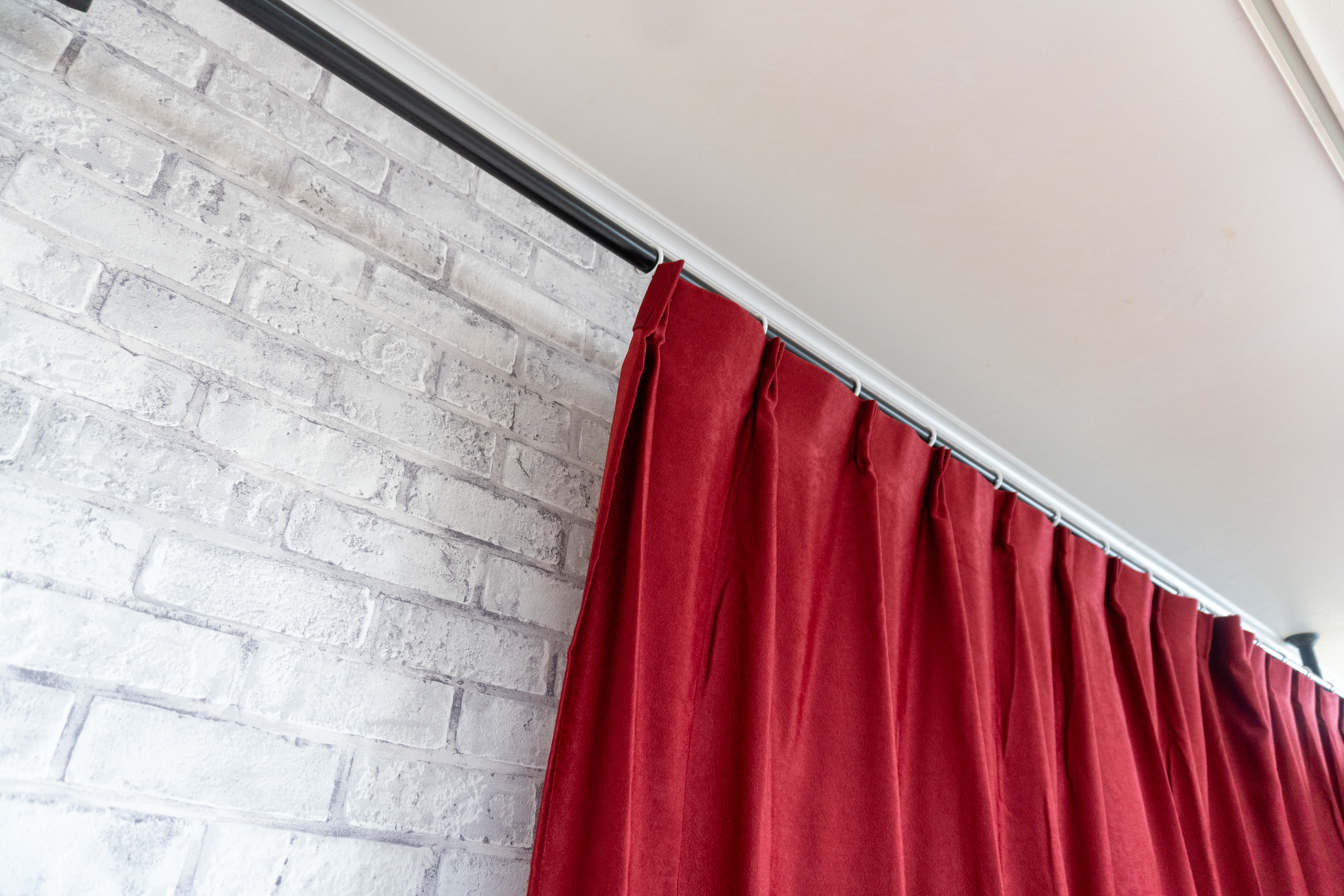 赤いカーテンを開くと白いレンガ壁。個人的にはこの壁がお気に入り。