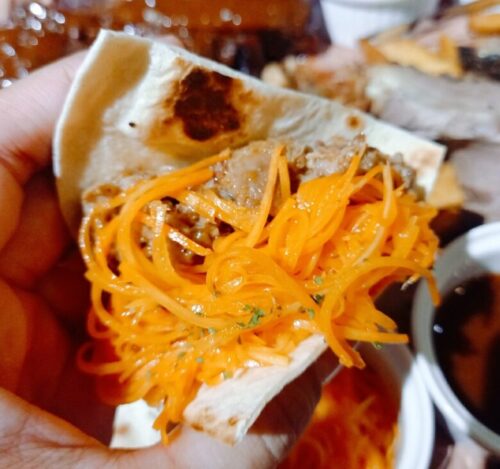 ナイフで切って、キャロットラペと一緒にトルティーヤに乗せてソースにつけるのがご店主のおススメ。