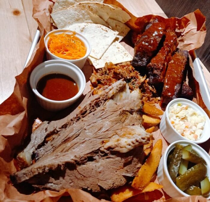 奥からスペアリブ・トルティーヤ・プルドポーク・ポテト・あか牛のブリスケット。