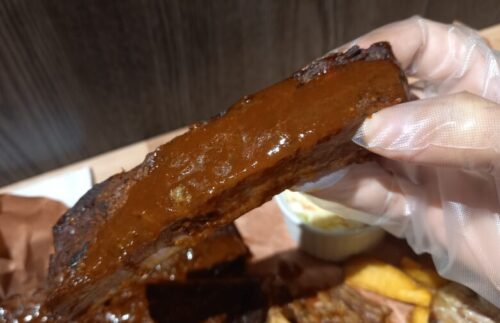 スペアリブは肉がみっしりしているのに嚙み切れる絶妙なかたさ。ビニール手袋をつけて手掴みで食べるのがベストです!