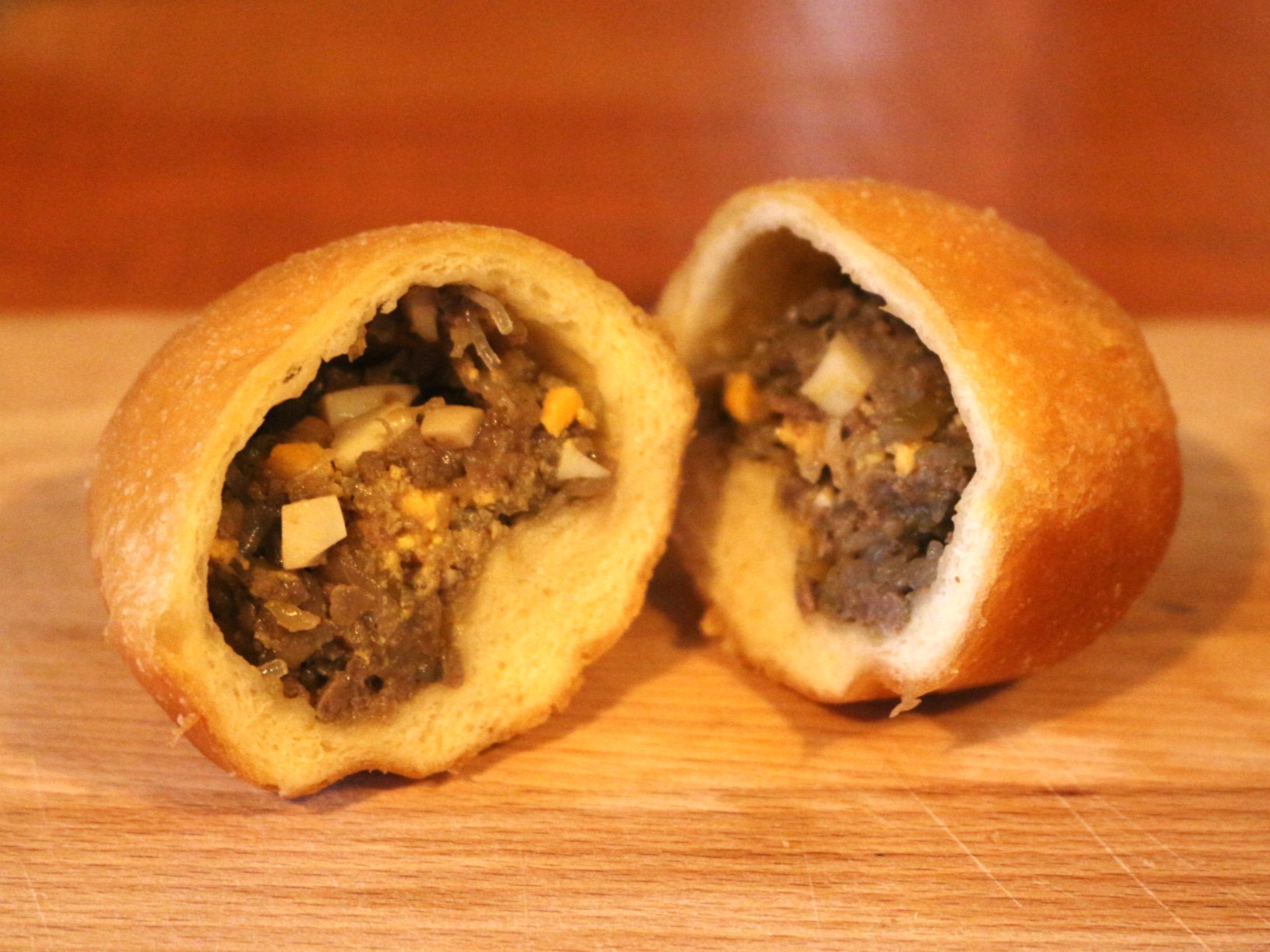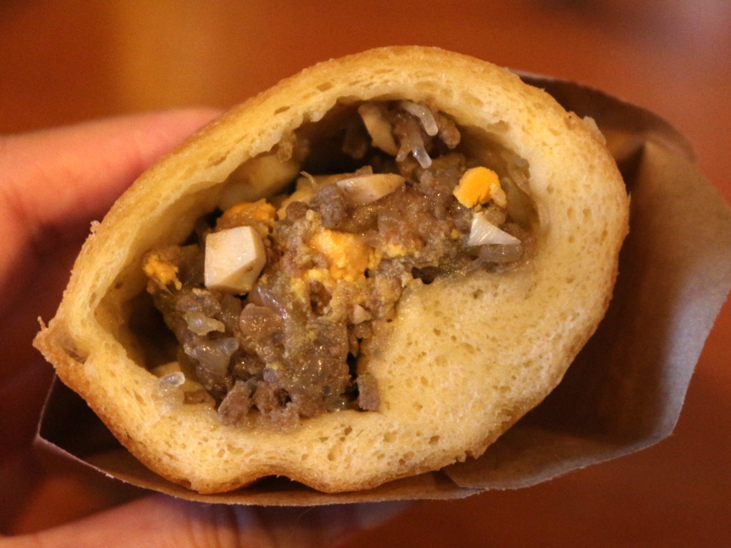 まずはピロシキと言えば思い浮かべる挽肉、春雨、玉ねぎが入ったコチラ。よくよく見てみると、ゆで卵も入ってます。