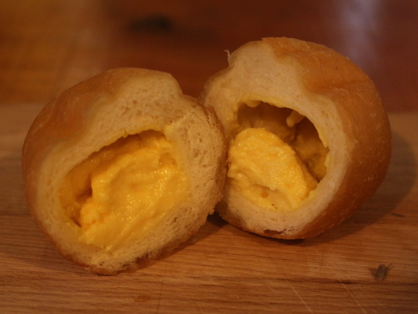 カスタードはピロシキの中にギッシリ詰まっています。たまごたっぷりのカスタードクリームで、懐かしい味。ドーナツみたいな感覚で、おやつとしてバクバク食べれそう。