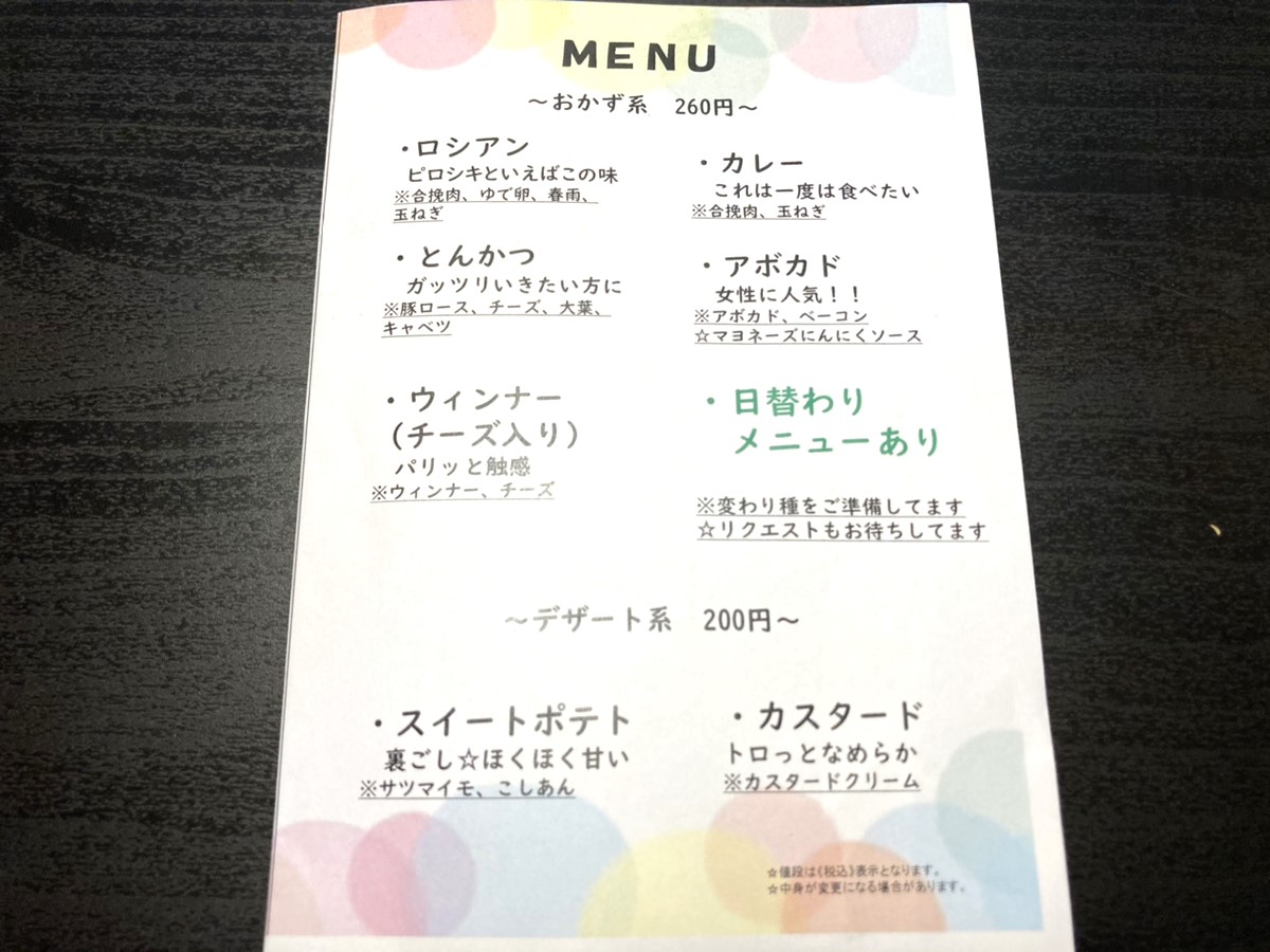 今回はスタンダードなロシアンに加えて、おかず系1つ、デザート系1つの合計3種類を購入しました。