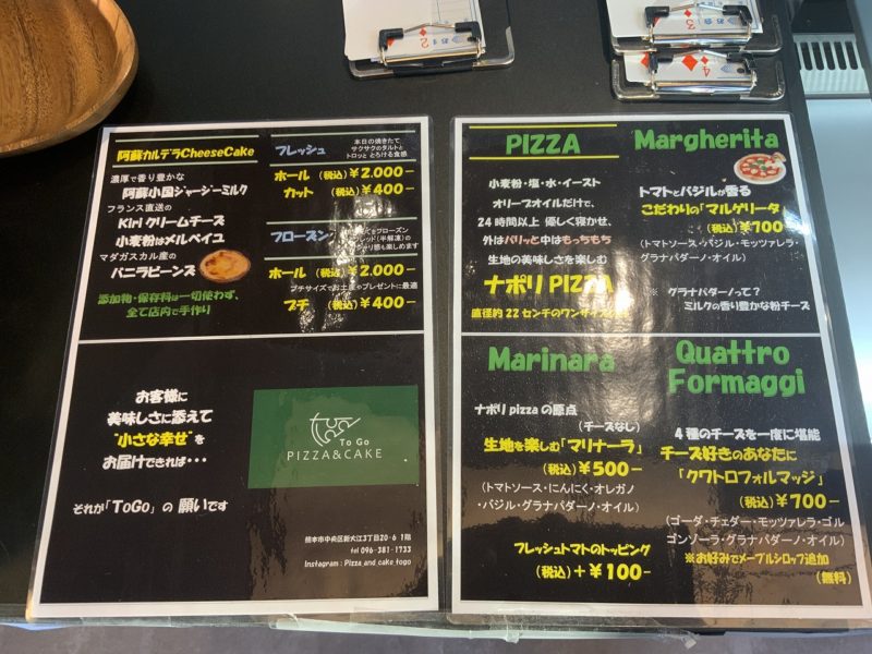 11月27日、保田窪のローソン向かいに、新しくピザとケーキのお店「ToGo(トゥーゴー)」がオープン!本格的なナポリピザが500円~というだけでも驚きですが、阿蘇小国ジャージーを使用した手作りのチーズケーキまで販売していました!