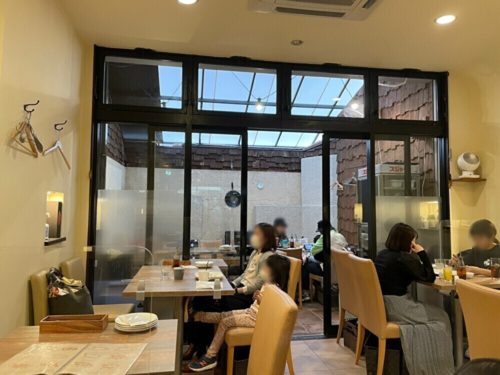 細長い通路を抜けると、奥にテーブル席、窓の奥にテラス席があり、平日でも大盛況!人気っぷりがうかがえます。
