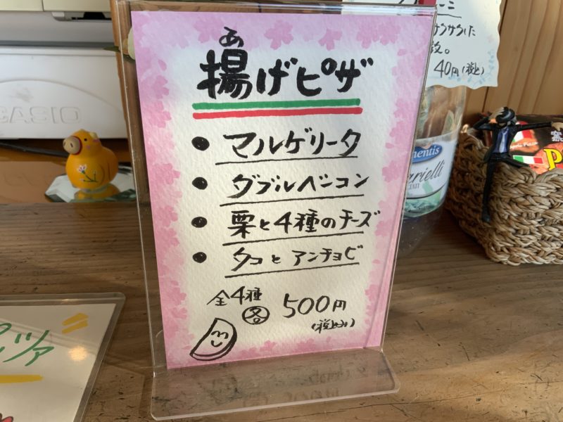 揚げピザは全4種類あり、どれも税込500円とワンコイン。悩ましいところですが、どうしても1つだけ気になるやつがありますねぇ。