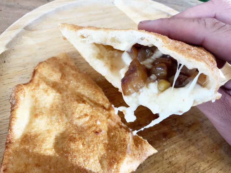 こちらが、「栗と4種のチーズ」の揚げピザです。テイクアウトもできますが、お店で食べていってもOK。