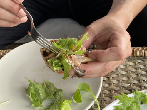 このようにして、フォークと手を使いサンドイッチのようにすると食べやすいとのこと。