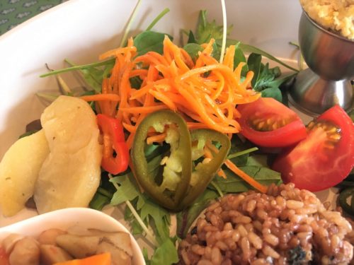 長雨の影響で葉物が少なく、サラダの生野菜は少なめとのことでしたが、人参ラぺにトマトの塩麴漬け、りんごのシナモンソテーなど、お野菜盛りだくさん!ハラペーニョのピクルスもありましたが、これがまあ、また辛いのなんの!刺激的でした。