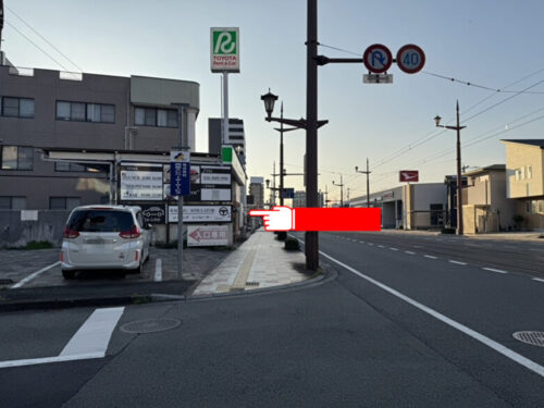 益城側から向かう際には、市電沿いにあるTOYOTAレンタカーの手前
