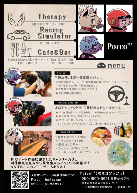 レーシングシミュレーター、カフェ&バー、医療系セラピー..なんとポルコダッシュはこれだけではありません。