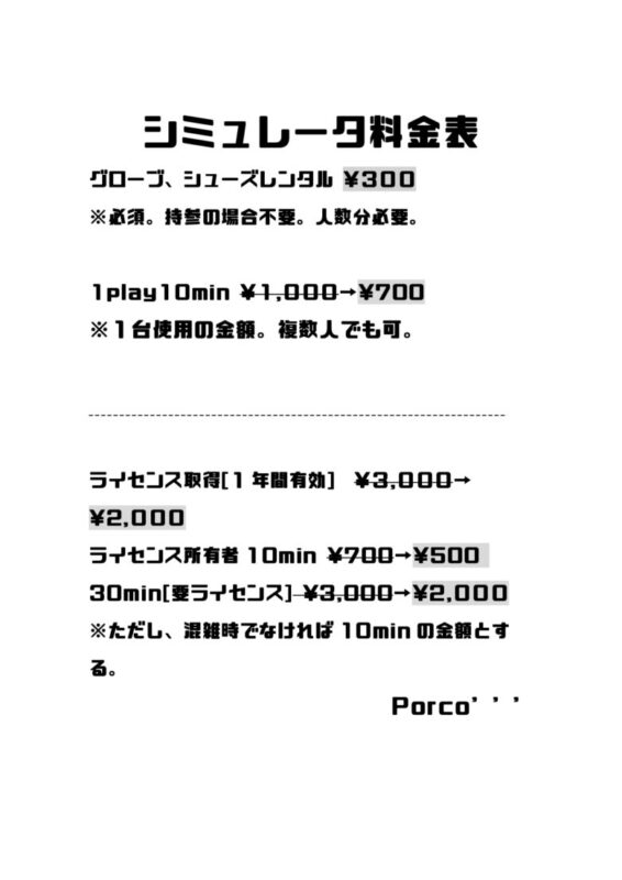 | 営業時間 | レーシングシミュレーター 15:00〜23:00 |