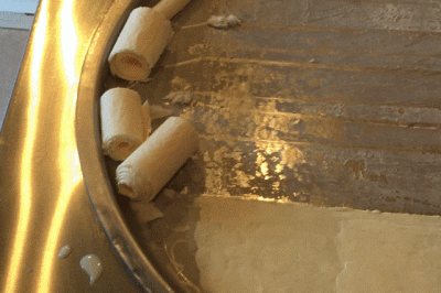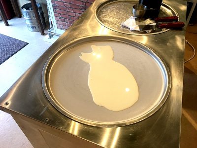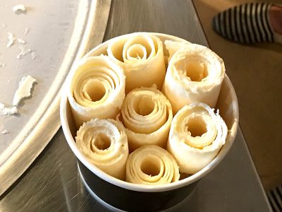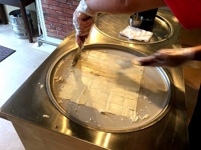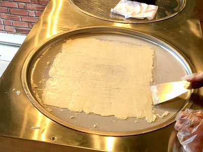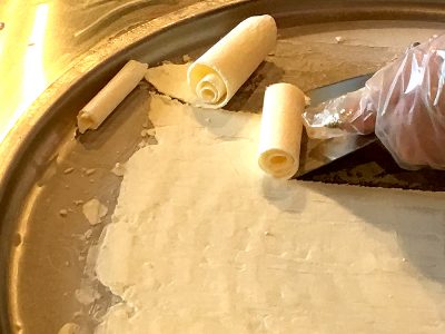 「ロールアイス」の原型が出来ました。丸めたクレープの皮のようにも見えますが、これ全てアイスなんですよ!