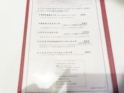 ベジタブルNAMIKIバーガーランチ830円(税込)、ベジタブルトマトカレーランチ880円(税込)があります。