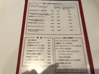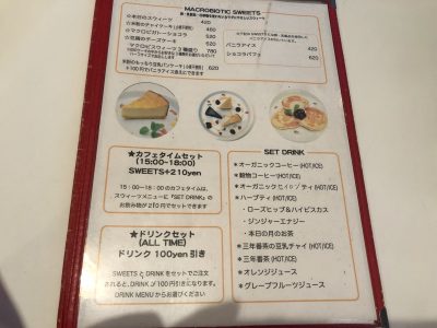 セットドリンクは無料です。オレンジジュースやグレープフルーツジュースもありますが、オーガニックコーヒーや穀物コーヒー、三年番茶など珍しいドリンクも選べます。
