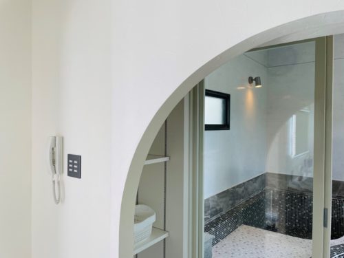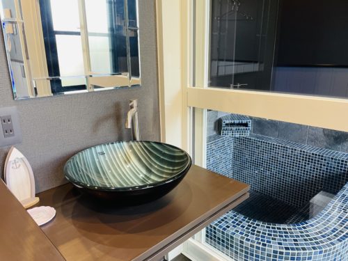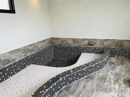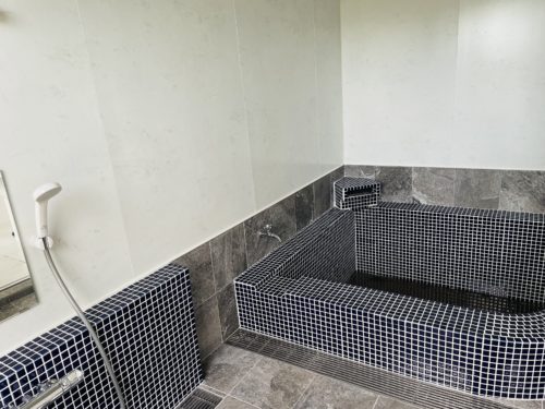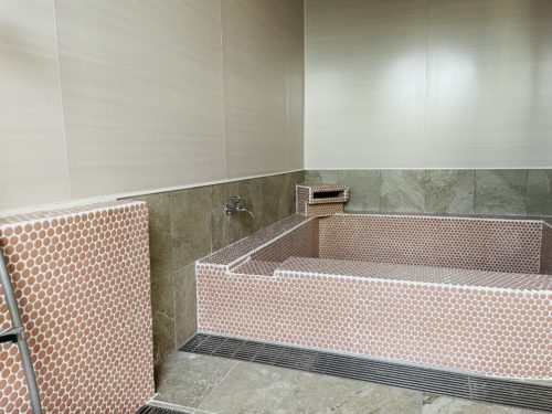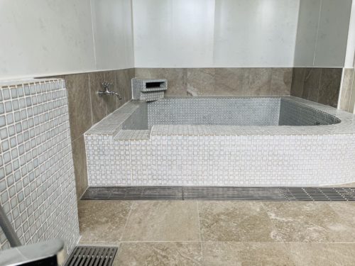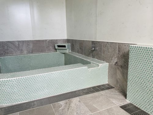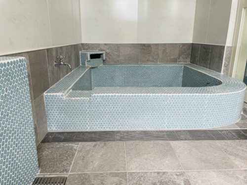 このタイルにお湯が入るとキラキラとしてさぞ気持ちがいいだろうなぁ。
