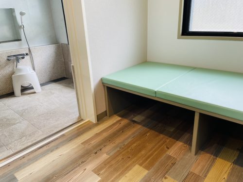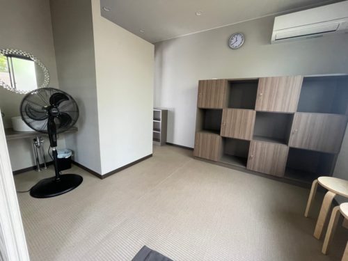 ゆったりとした休憩室。ダイソンのドライヤーがあったり、お手洗いもついています。ブルートゥース接続で音楽も流せますよ。