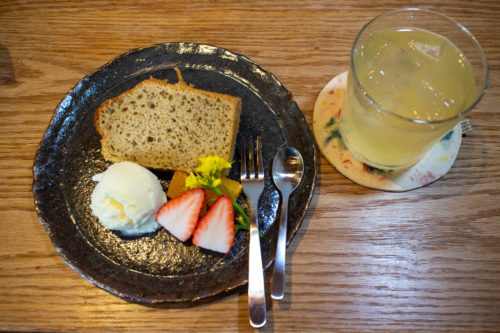 こちらはランチセットのデザート、アールグレイのシフォンケーキと晩柑シロップのソーダ割り。