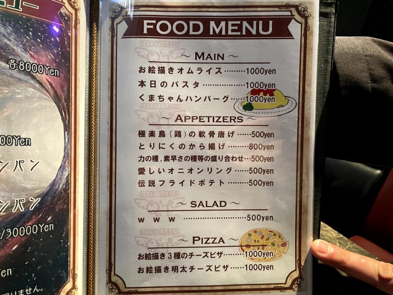 どれも気になりますが、今回はメイドカフェを全力で満喫するためにお絵描きオムライスとお絵描きピザを注文しました!